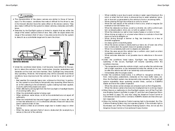 • When there is a malfunction in the EyeSight system, turn off the Pre-Collision Braking System( � Refer to page 31) and the Lane Departure Warning( � Refer to page 73), and stop using the Adaptive Cruise Control or Conventional Cruise Control. Contact a SUBARU dealer and have the system inspected.