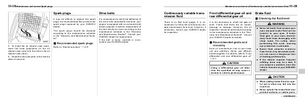 11-18 Maintenance and service/Spark plugs Spark plugs Drive belts S11AH S11AI It may be difficult to replace the spark plugs. It is recommended that you have the spark plugs replaced by your SUBARU dealer. It is unnecessary to check the deflection of the drive belt periodically because your engine is equipped with an automatic belt tension adjuster. However, replacement of the belt should be done according to the maintenance schedule in the “Warranty and Maintenance Booklet”. Consult your SUBARU dealer for replacement. If the belt is loose, cracked or worn, contact your SUBARU dealer. The spark plugs should be replaced according to the maintenance schedule in the “Warranty and Maintenance Book- let”. & Recommended spark plugs 5. To install the air cleaner case (rear), insert the three projections on the air cleaner case (rear) into the slits on the air cleaner case (front). 6. Install the removed parts in the reverse order of removal. Refer to “Electrical system” F12-9. S11AH01