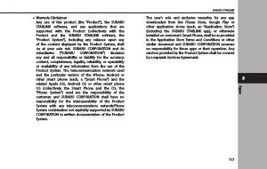 � Warranty Disclaimer Any use of this product ( the “ Product ”), the SUBARU STARLINK software , and any applications that are supported with the Product ( collectively with the Product and the SUBARU STARLINK software , the “ Product System ”), including any reliance upon any of the content displayed by the Product System , shall be at your sole risk . SUBARU CORPORATION and its subsidiaries (“ SUBARU CORPORATION ”) disclaims any and all responsibility or liability for the accuracy , content , completeness , legality , reliability , or operability or availability of any information from the use of the Product System . The telecommunication network used and the particular version of the iPhone , Android or other smart phone ( each , a “ Smart Phone ”) and the related Apple iOS , Android OS or other smart phone OS ( collectively , the Smart Phone and the OS , the “ Phone System ”) used are the responsibility of the customer , and SUBARU CORPORATION shall have no responsibility for the interoperability of the Product System with any telecommunications network / Phone System combination not explicitly supported by SUBARU CORPORATION in written documentation of the Product System .