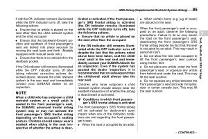 If the ON indicator still remains illuminated while the OFF indicator turns off despite the fact that the actions noted above have been taken , seat the child / small adult in the rear seat and immediately contact your SUBARU dealer for an inspection . Even if the system has passed the dealer inspection , it is recommended that on subsequent trips the child / small adult always take the rear seat .
