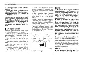 . All doors , the rear gate ( Outback / Subaru Outback Wilderness )/ trunk lid ( Legacy ) and fuel filler lid will lock , an electronic chirp will sound once , the hazard warning flashers will flash once , and the security indicator light will start flashing rapidly . . If any of the doors or the rear gate ( Outback / Subaru Outback Wilderness )/ trunk lid ( Legacy ) is not fully closed , an electronic chirp sounds five times and the hazard warning flashers flash five times to alert you that the doors ( or the rear gate ( Outback / Subaru Outback Wilderness )/ trunk lid ( Legacy )) are not properly closed . When you close the door , doors will automatically lock and the system will automatically arm in 30 seconds .