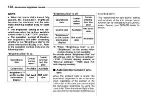 . When the control dial is turned fully upward , the illumination brightness becomes the maximum and the automatic dimming function does not work at all . . The brightness setting is not canceled even when the ignition switch is turned to the “ LOCK ”/“ OFF ” position . . The operation method of illumination brightness will differ depending whether or not “ Brightness Dial ” in the center information display is on . Refer to the operation method indicated the following table .