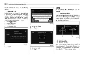 If a birthday or anniversary is approaching , a message will be displayed when the ignition switch is turned to the “ ON ” position . This function can be set to on or off by the “ Reminder Screen ”. For details , refer to “ General settings ” FP239 .
