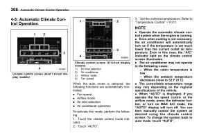 . Operate the automatic climate control system when the engine is running . . Even when cooling is not necessary , the air conditioner will automatically turn on if the temperature is set much lower than the current outlet air temperature . Even in this case , the “ A / C ” indicator light on the climate control screen illuminates . . The air conditioner may not operate in the following cases : – When the cabin temperature is low – When the ambient temperature decreases close to 328F ( 08C ) . The controllable temperature range may vary depending on the regional specifications of the vehicle . . When “ AUTO ” is displayed , if you operate the fan speed control or the airflow mode , press the defroster button , or turn on MAX A / C mode , the “ AUTO ” display will turn off . You can then manually control the system as desired using the climate control screen . To change the system back to auto mode , touch “ AUTO ”.