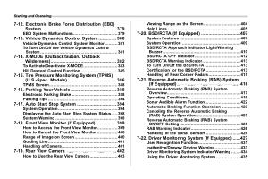 7-18 . Front View Monitor ( If Equipped ) ................ 399 How to Access the Front View Monitor ................ 399 How to Cancel the Front View Monitor ................ 400 Range of Image on Screen .................................. 400 Guiding Line ....................................................... 401 Handling of Camera ............................................ 401