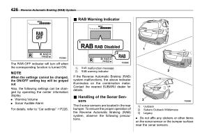 If the Reverse Automatic Braking ( RAB ) system malfunctions , the above indicator illuminates on the combination meter . Contact the nearest SUBARU dealer for details .