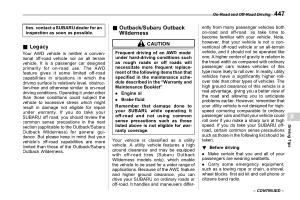 Your AWD vehicle is neither a conventional off-road vehicle nor an all terrain vehicle . It is a passenger car designed primarily for on-road use . The AWD feature gives it some limited off-road capabilities in situations in which the driving surface is relatively level , obstruction-free and otherwise similar to on-road driving conditions . Operating it under other than those conditions could subject the vehicle to excessive stress which might result in damage not eligible for repair under warranty . If you do take your SUBARU off road , you should review the common sense precautions in the next section ( applicable to the Outback / Subaru Outback Wilderness ) for general guidance . But please keep in mind that your vehicle ’ s off-road capabilities are more limited than those of the Outback / Subaru Outback Wilderness .