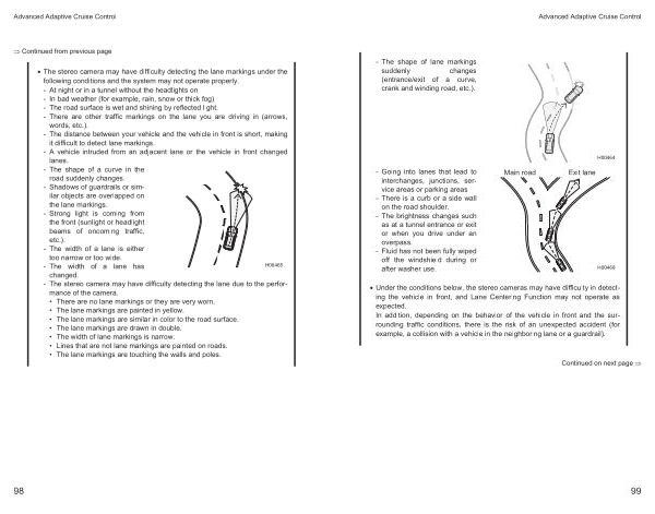 • The stereo camera may have difficulty detecting the lane markings under the following conditions and the system may not operate properly . - At night or in a tunnel without the headlights on - In bad weather ( for example , rain , snow or thick fog ) - The road surface is wet and shining by reflected light . - There are other traffic markings on the lane you are driving in ( arrows , words , etc .). - The distance between your vehicle and the vehicle in front is short , making it difficult to detect lane markings . - A vehicle intruded from an adjacent lane or the vehicle in front changed lanes . - The shape of a curve in the road suddenly changes .