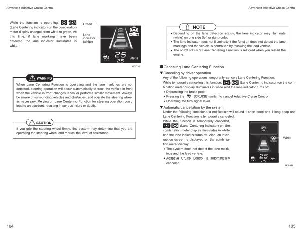 �Canceling by driver operation Any of the following operations temporarily cancels Lane Centering Function . While temporarily canceling this function , / ( Lane Centering indicator ) on the combination meter display illuminates in white and the lane indicator turns off .