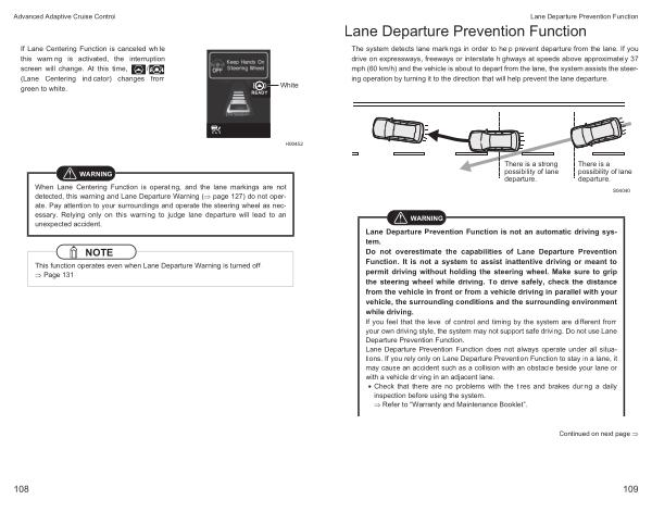 When Lane Centering Function is operating , and the lane markings are not detected , this warning and Lane Departure Warning ( � page 127 ) do not operate . Pay attention to your surroundings and operate the steering wheel as necessary . Relying only on this warning to judge lane departure will lead to an unexpected accident .