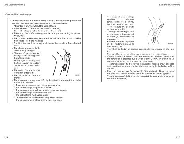 • The stereo camera may have difficulty detecting the lane markings under the following conditions and the system may not operate properly . - At night or in a tunnel without the headlights on - In bad weather ( for example , rain , snow or thick fog ) - The road surface is wet and shining by reflected light . - There are other traffic markings on the lane you are driving in ( arrows , words , etc .). - The distance between your vehicle and the vehicle in front is short , making it difficult to detect lane markings . - A vehicle intruded from an adjacent lane or the vehicle in front changed lanes . - The shape of a curve in the road suddenly changes .