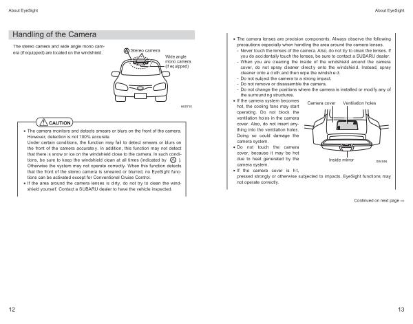 • The camera monitors and detects smears or blurs on the front of the camera . However , detection is not 100 % accurate . Under certain conditions , the function may fail to detect smears or blurs on the front of the camera accurately . In addition , this function may not detect that there is snow or ice on the windshield close to the camera . In such conditions , be sure to keep the windshield clean at all times ( indicated by ). Otherwise the system may not operate correctly . When this function detects that the front of the stereo camera is smeared or blurred , no EyeSight functions can be activated except for Conventional Cruise Control .