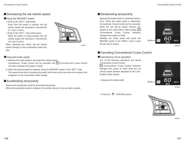 ●Using the brake pedal 1 . Depress the brake pedal to decrease the vehicle speed . Conventional Cruise Control will be canceled and indicator ) changes from green to white .