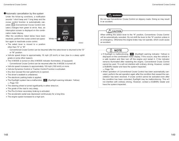 • When operation of Conventional Cruise Control has been automatically canceled , perform the set operation again after the condition that caused the cancellation has been resolved . If cruise control cannot be activated even after the condition has been corrected , EyeSight may be malfunctioning . This will not interfere with ordinary driving . However , contact a SUBARU dealer and have the system inspected .