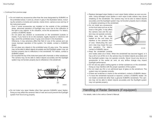 • To have the windshield replaced or repaired , contact a SUBARU dealer . Do not install a windshield other than a genuine SUBARU windshield . The camera may not be able to detect objects accurately and the EyeSight system may not operate properly .