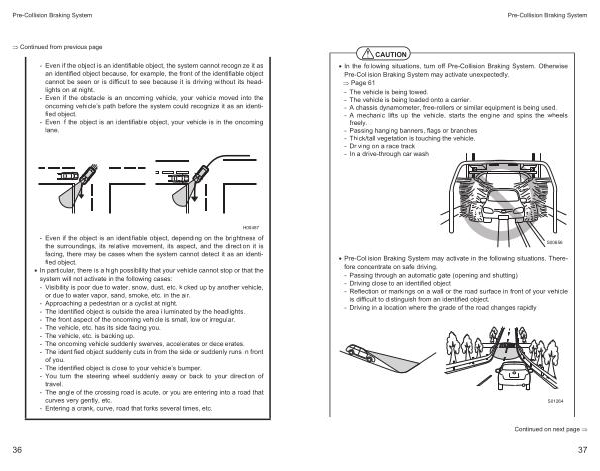 • In particular , there is a high possibility that your vehicle cannot stop or that the system will not activate in the following cases : - Visibility is poor due to water , snow , dust , etc . kicked up by another vehicle , or due to water vapor , sand , smoke , etc . in the air . - Approaching a pedestrian or a cyclist at night . - The identified object is outside the area illuminated by the headlights . - The front aspect of the oncoming vehicle is small , low or irregular . - The vehicle , etc . has its side facing you . - The vehicle , etc . is backing up . - The oncoming vehicle suddenly swerves , accelerates or decelerates . - The identified object suddenly cuts in from the side or suddenly runs in front of you . - The identified object is close to your vehicle ’ s bumper . - You turn the steering wheel suddenly away or back to your direction of travel . - The angle of the crossing road is acute , or you are entering into a road that curves very gently , etc . - Entering a crank , curve , road that forks several times , etc .