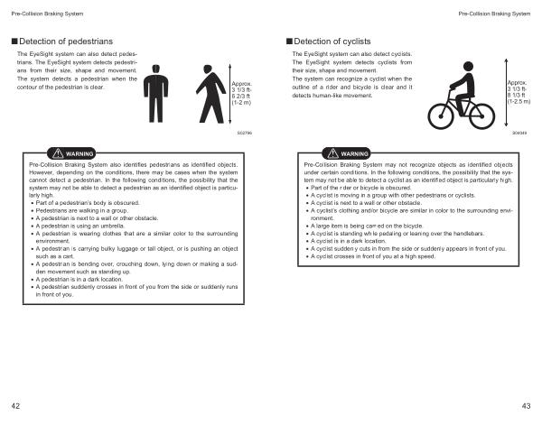 The EyeSight system can also detect cyclists . The EyeSight system detects cyclists from their size , shape and movement . The system can recognize a cyclist when the outline of a rider and bicycle is clear and it detects human-like movement .