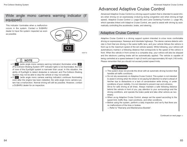 • If ( wide angle mono camera warning indicator ) illuminates while ( Pre-Collision Braking System OFF indicator light ) is not illuminated , the field of view of the EyeSight system is narrower than usual . In this situation , the ability of EyeSight to detect obstacles is reduced , and Pre-Collision Braking System may not be able to stop the vehicle or may not activate .