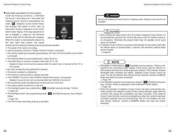 �Automatic cancellation by the system Under the following conditions , a notification will sound 1 short beep and 1 long beep and Adaptive Cruise Control is automatically canceled . ( Adaptive Cruise Control indicator ) changes from green to white . Also , an interruption screen is displayed on the combination meter display . If the stay-stopped function is engaged ( � page 83 ), the electronic parking brake will be automatically engaged . White When the engine is automatically stopped by