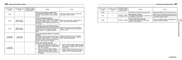 Access key takeout without “ P ” position warning : The driver exits the vehicle with the access key fob and closes the driver ’ s door while the push-button ignition switch is in a position other than “ OFF ” and the select lever is in a position other than the “ P ” position .