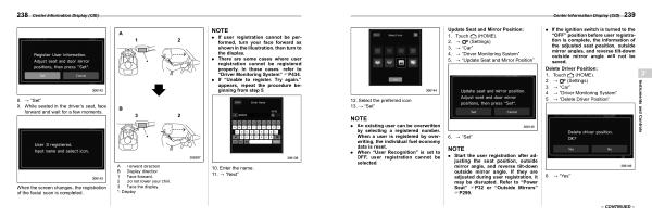 . Start the user registration after adjusting the seat position , outside mirror angle , and reverse tilt-down outside mirror angle . If they are adjusted during user registration , it may be disrupted . Refer to “ Power Seat ” FP32 or “ Outside Mirrors ” FP299 .