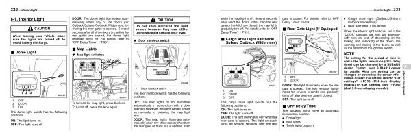 DOOR : The dome light illuminates automatically when any of the doors ( for Outback / Subaru Outback Wilderness , including the rear gate ) is opened . Several seconds after all of the doors ( including the rear gate ) are closed , the dome light gradually turns off . For details , refer to “ OFF Delay Timer ” FP331 .