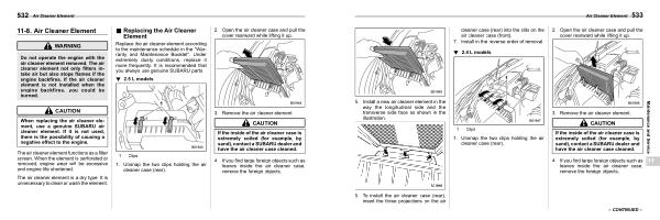 Replace the air cleaner element according to the maintenance schedule in the “ Warranty and Maintenance Booklet ”. Under extremely dusty conditions , replace it more frequently . It is recommended that you always use genuine SUBARU parts .