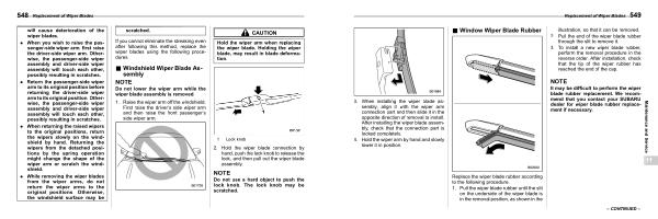 . When returning the raised wipers to the original positions , return the wipers slowly on the windshield by hand . Returning the wipers from the detached positions by the spring operation might change the shape of the wiper arm or scratch the windshield .
