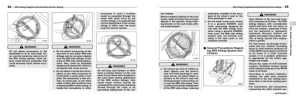 . Do not attach accessories to the door trim or near either SRS side airbags and do not place objects near the SRS side airbags . In the event of SRS side airbag deployment , they could be propelled dangerously toward the vehicle ’ s occupants and cause injuries .