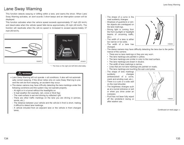 • Lane Sway Warning will not operate in all conditions . It also will not automatically correct swaying . If the driver relies only on Lane Sway Warning to prevent the vehicle from swaying , an accident may occur .