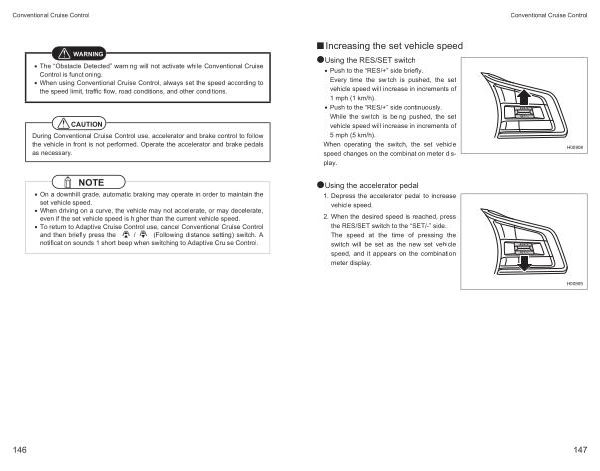 • Push to the “ RES /+” side continuously . While the switch is being pushed , the set vehicle speed will increase in increments of 5 mph ( 5 km / h ).