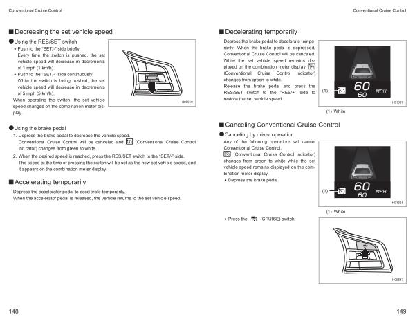 ●Using the brake pedal 1 . Depress the brake pedal to decrease the vehicle speed . Conventional Cruise Control will be canceled and indicator ) changes from green to white .