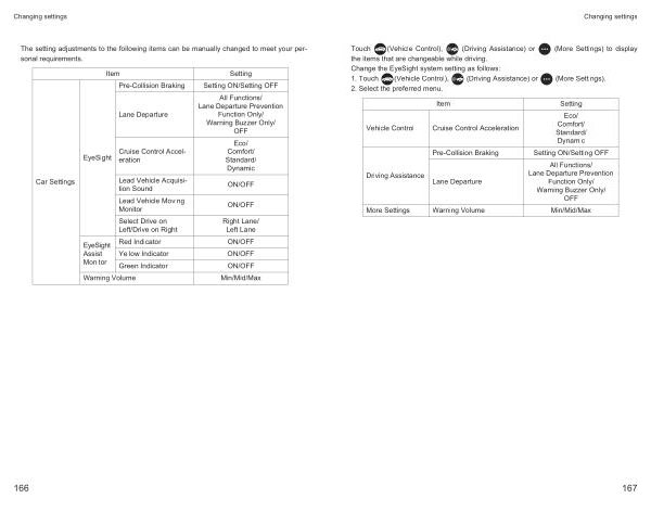 Touch ( Vehicle Control ), ( Driving Assistance ) or ( More Settings ) to display the items that are changeable while driving . Change the EyeSight system setting as follows : 1 . Touch ( Vehicle Control ), ( Driving Assistance ) or ( More Settings ). 2 . Select the preferred menu .