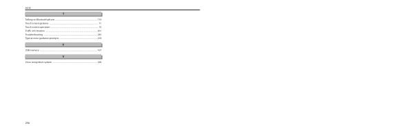 Talking on Bluetooth phone ................................................................................ 116 Touch screen gestures ............................................................................................. 71 Touch screen operation .......................................................................................... 72 Traffic information ................................................................................................... 201 Troubleshooting ...................................................................................................... 243 Typical voice guidance prompts ........................................................................ 218