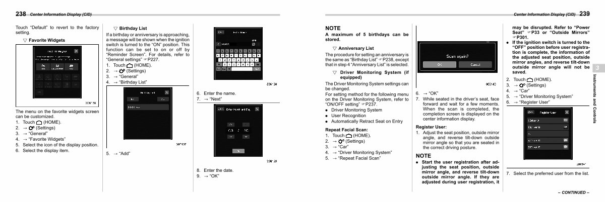 If a birthday or anniversary is approaching, a message will be shown when the ignition switch is turned to the“ ON” position. This function can be set to on or off by“ Reminder Screen”. For details, refer to“ General settings” FP227.