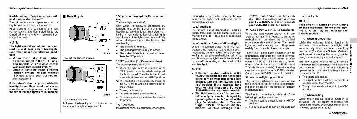 . If the light control switch is in the“ AUTO” position and the headlights do not turn on when it becomes dark outside, turn the light switch to the“” position. If this happens, have your vehicle inspected by your SUBARU dealer as soon as possible.