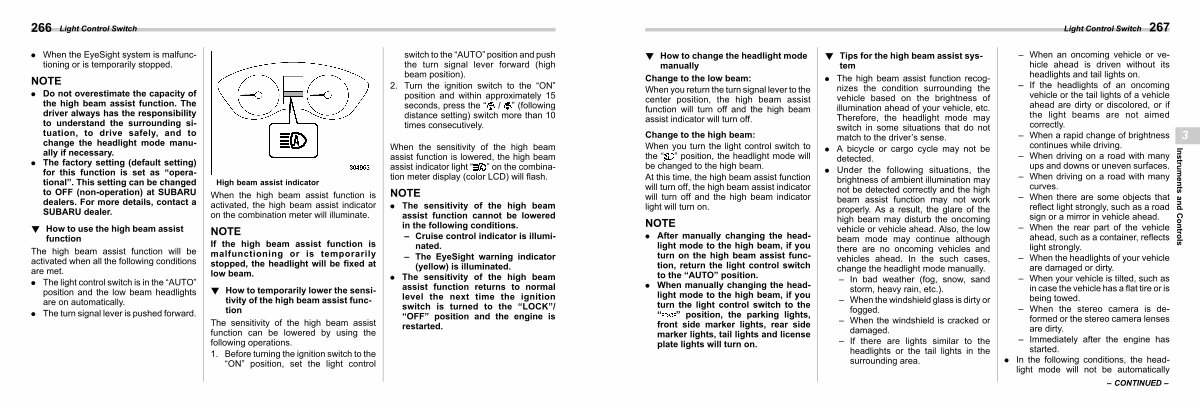 . The sensitivity of the high beam assist function cannot be lowered in the following conditions. – Cruise control indicator is illuminated. – The EyeSight warning indicator