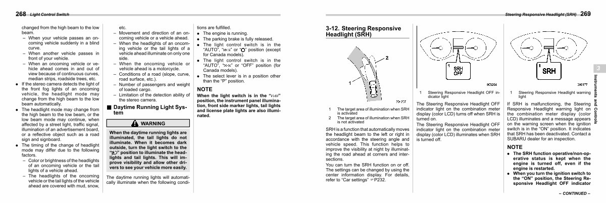 If SRH is malfunctioning, the Steering Responsive Headlight warning light on the combination meter display( color LCD) illuminates and a message appears on the warning screen when the ignition switch is in the“ ON” position. It indicates that SRH has been deactivated. Contact a SUBARU dealer for an inspection.