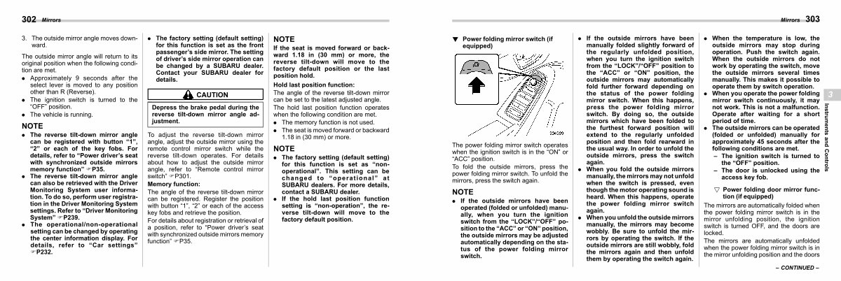 . If the outside mirrors have been manually folded slightly forward of the regularly unfolded position, when you turn the ignition switch from the“ LOCK”/“ OFF” position to the“ ACC” or“ ON” position, the outside mirrors may automatically fold further forward depending on the status of the power folding mirror switch. When this happens, press the power folding mirror switch. By doing so, the outside mirrors which have been folded to the furthest forward position will extend to the regularly unfolded position and then fold rearward in the usual way. In order to unfold the outside mirrors, press the switch again.