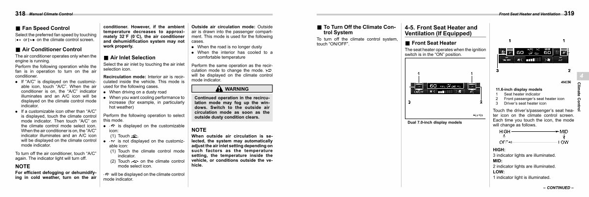 Continued operation in the recirculation mode may fog up the windows. Switch to the outside air circulation mode as soon as the outside dusty condition clears.