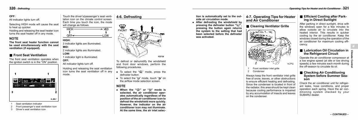 Check the air conditioner unit for refrigerant leaks, hose conditions, and proper operation each spring. Have the air conditioning system checked by your SUBARU dealer.