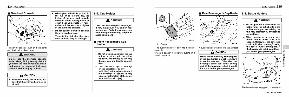Take care to avoid spills. Beverages, if hot, might burn you and / or your passengers. Spilled beverages may also damage upholstery, carpets or audio equipment.