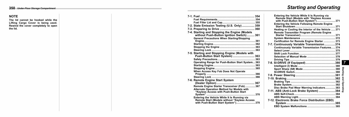 7-8. SI-DRIVE( If Equipped).................................... 380 Intelligent( I) Mode............................................. 380 Sport Sharp( S #) Mode....................................... 380 SI-DRIVE Switch................................................. 380 7-9. Power Steering................................................ 381 7-10. Braking........................................................... 382 Braking Tips...................................................... 382 Brake System..................................................... 382 Disc Brake Pad Wear Warning Indicators............ 383