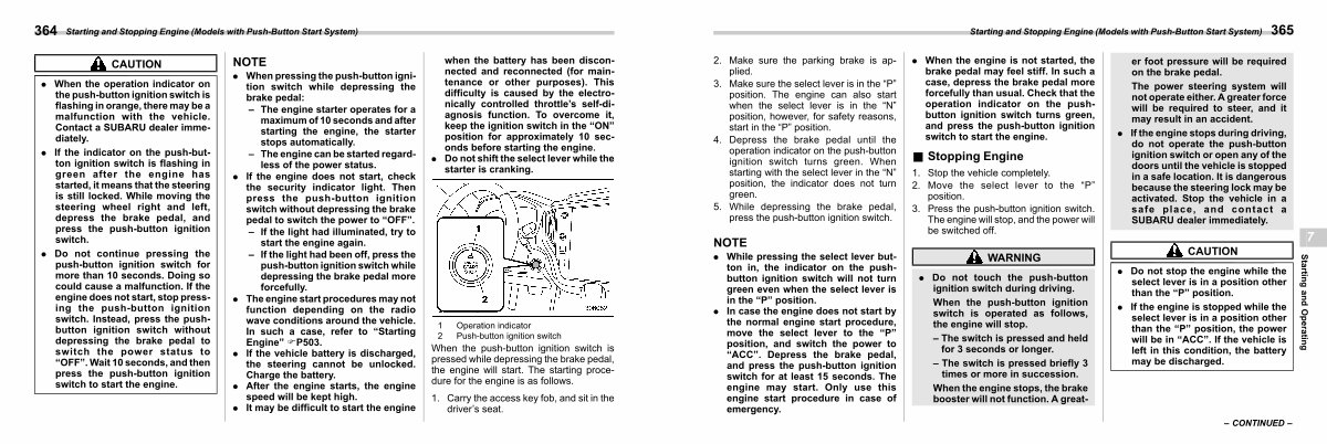 . When the operation indicator on the push-button ignition switch is flashing in orange, there may be a malfunction with the vehicle. Contact a SUBARU dealer immediately.