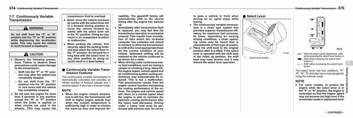 . The continuously variable transmission is a chain type system that provides superior transmission efficiency for maximum fuel economy. At times, depending on varying driving conditions, a chain operating noise may be heard that is characteristic of this type of system.