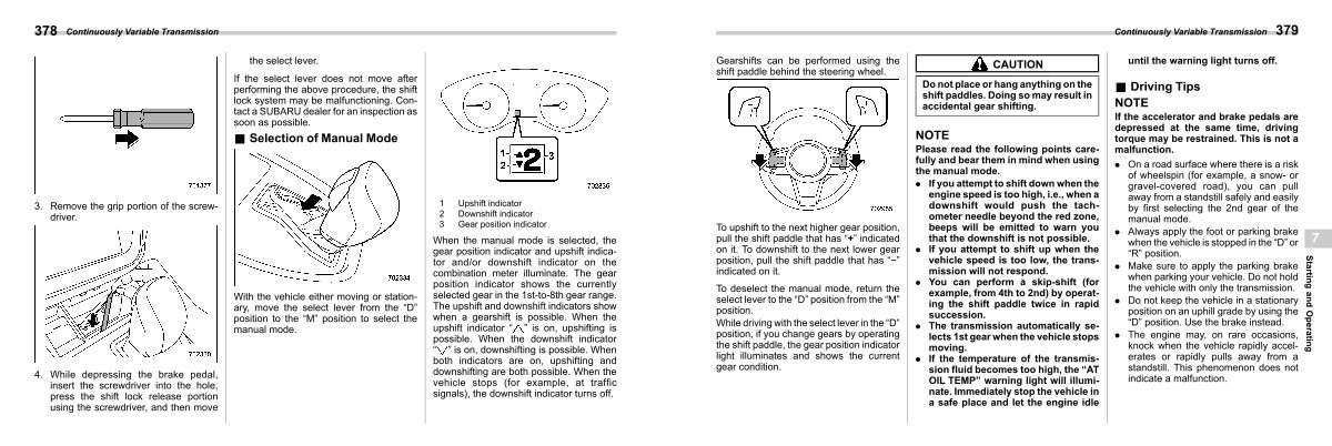 To upshift to the next higher gear position, pull the shift paddle that has“+” indicated on it. To downshift to the next lower gear position, pull the shift paddle that has“ −” indicated on it.