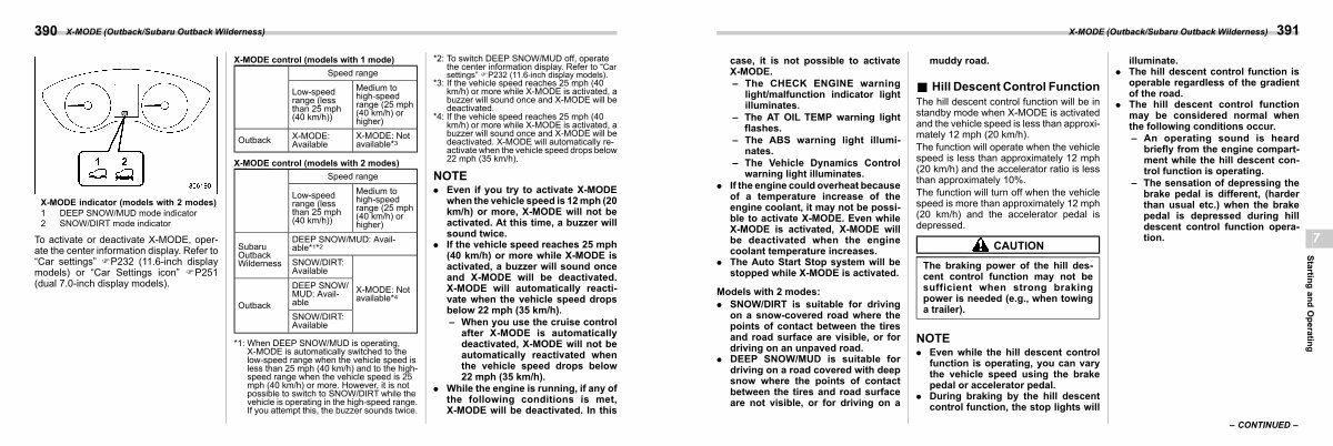 * 4: If the vehicle speed reaches 25 mph( 40 km / h) or more while X-MODE is activated, a buzzer will sound once and X-MODE will be deactivated. X-MODE will automatically reactivate when the vehicle speed drops below 22 mph( 35 km / h).