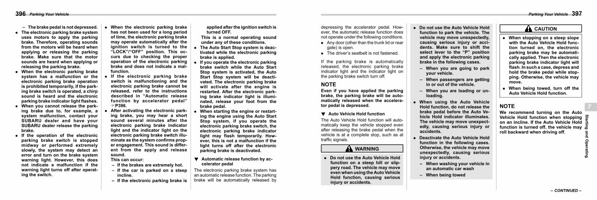 . Do not use the Auto Vehicle Hold function to park the vehicle. The vehicle may move unexpectedly, causing serious injury or accidents. Make sure to shift the select lever to the“ P” position and apply the electronic parking brake in the following cases.