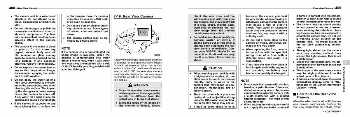 . Do not disassemble or modify the camera, switch or wiring. If smoke comes out or you smell a strange odor, stop using the rear view camera immediately. Contact your SUBARU dealer for an inspection. Continued use may result in accident, fire or electric shock.