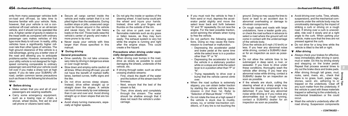 . Do not allow the vehicle tires to be submerged in deep sand, a river, or seawater. If you have to drive under these conditions, thoroughly wash the vehicle after driving. If you hear any abnormal noise while driving, contact a SUBARU dealer for an inspection as soon as possible.